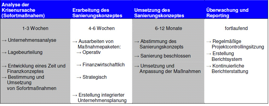 - Ermittlung des Kapitalbedarfs, bzw. Definition evtl. erforderlicher Stundungsvereinbarungen oder Forderungsverzichte.